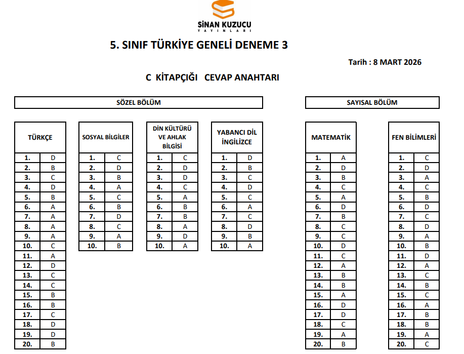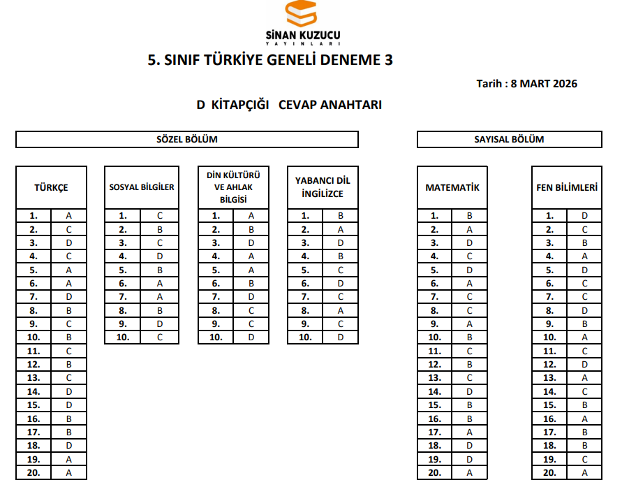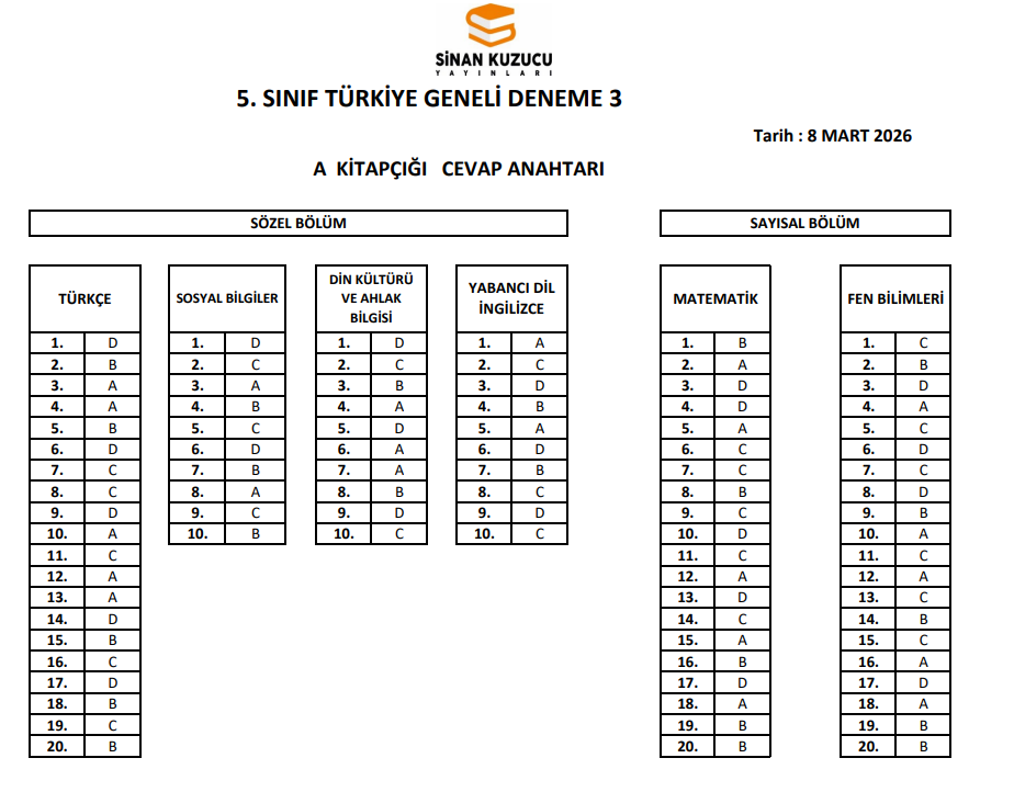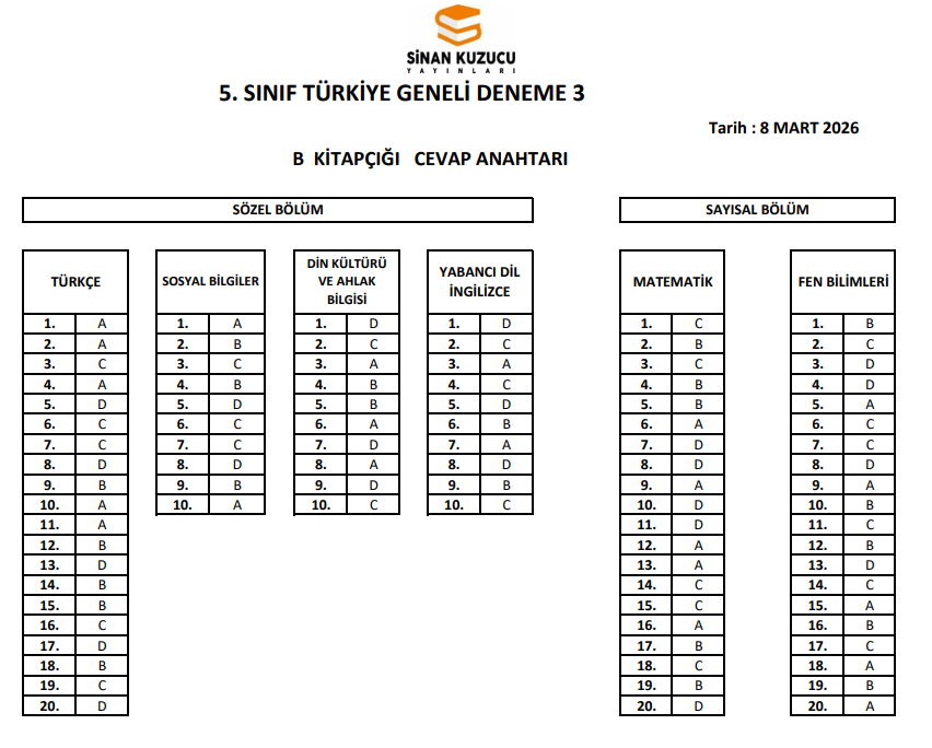 6-8 MART 2026 SİNAN KUZUCU 3.DENEME 5.SINIF