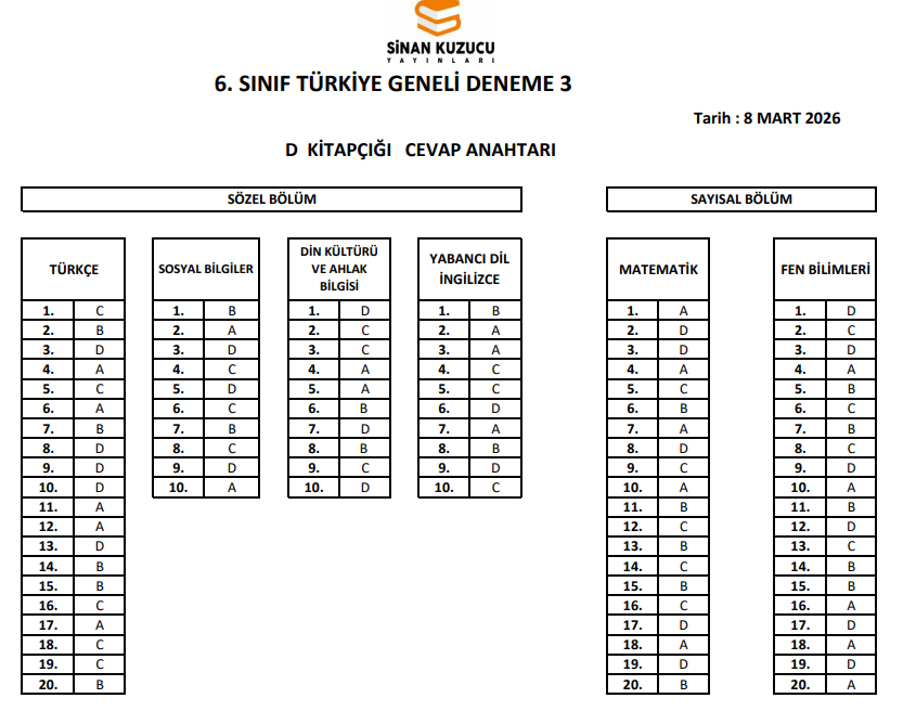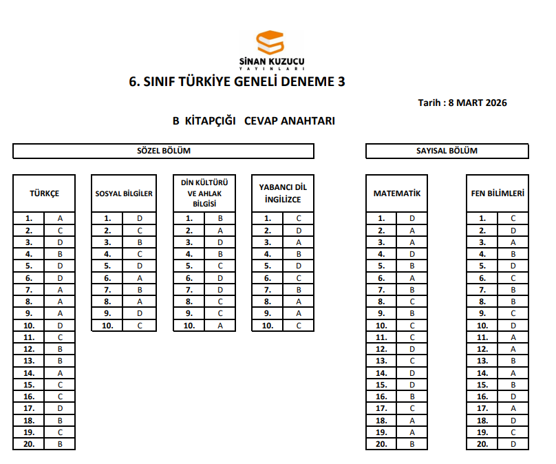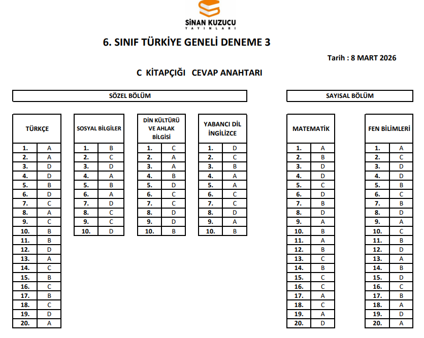 6-8 MART 2026 SİNAN KUZUCU 3.DENEME 6.SINIF